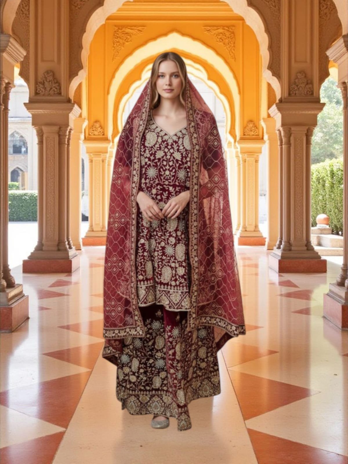 Embroidered Red Elegant Sharara Suit